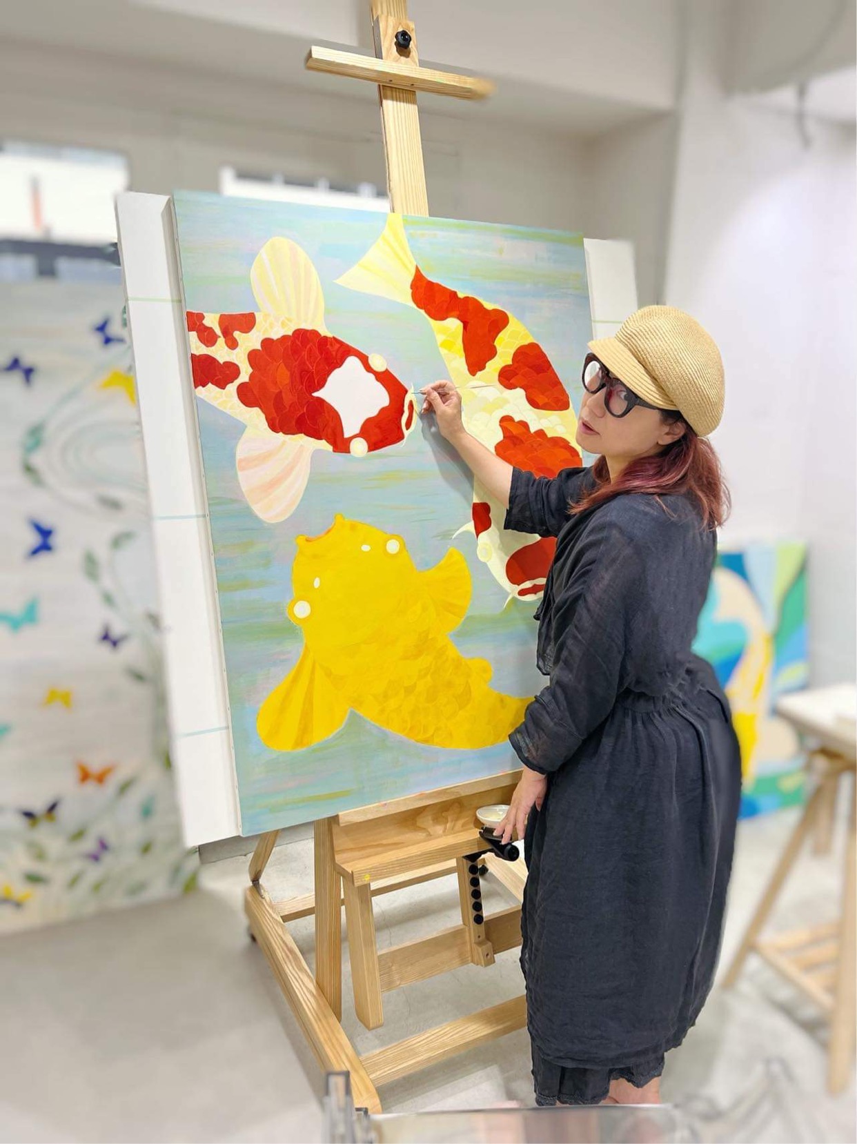大手企業のブランディグプロジェクトに数多く携わるなか、2018年初頭、一夜にして画家になる。その場にあったノートとペンで突然描いた絵は、細胞が増殖するような絵だった。宇宙からダウンロードするようにして描き続けるうちに、植物や魚、蝶、蛙、人、船、エネルギー等の絵に展開している。絵を描くために大切にしていることは、世界を旅しながらエネルギーに触れること。